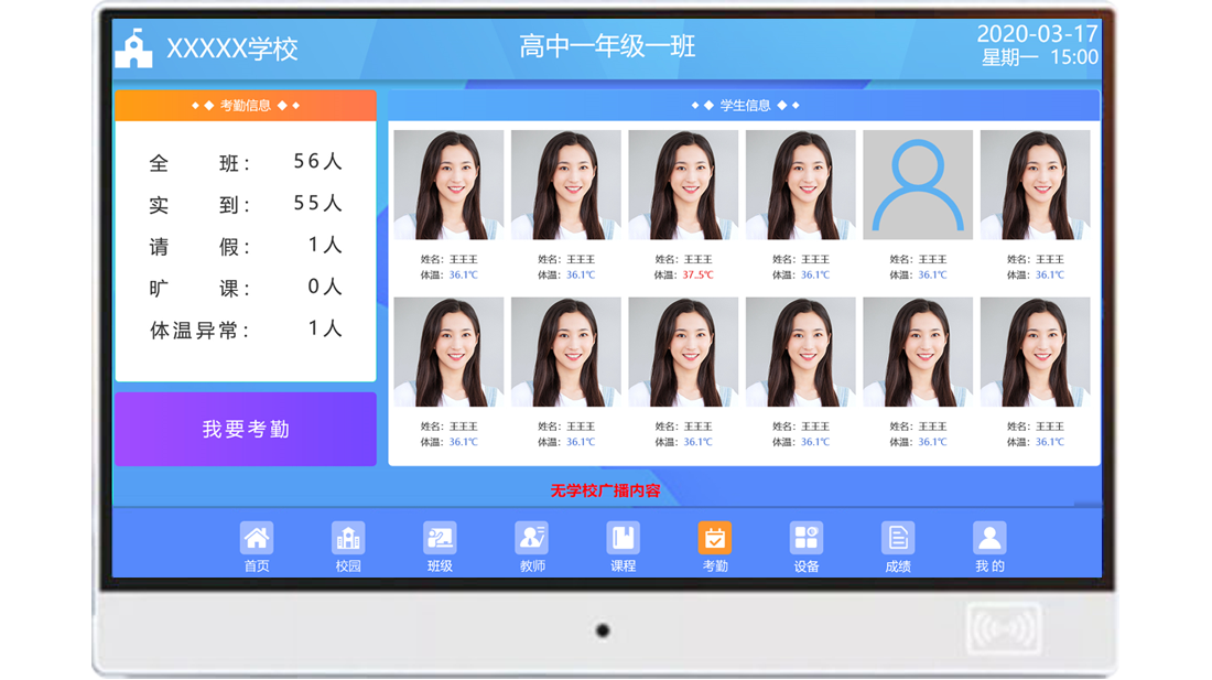 電子班牌可以準確對比學生身份,人臉識別率可達到99.9%。